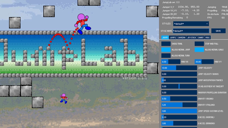 JumpLab is an educational tool for experiencing and learning parameter tuning of the 3Cs (Character, Controls, Camera) in game development. It uses both 2D and 3D jump games as subjects.