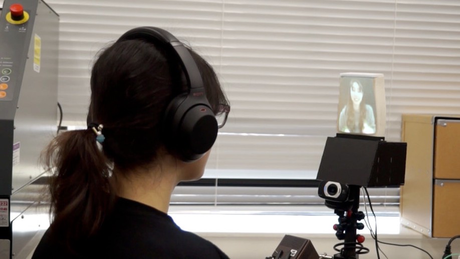 FlexFace is a head gesture display system for telecommunication. Traditional video communication systems use rigid flat screens, which feel inorganic. FlexFace applies the principles of “squash and stretch” from animation techniques to create more lifelike movements by deforming a flexible screen.