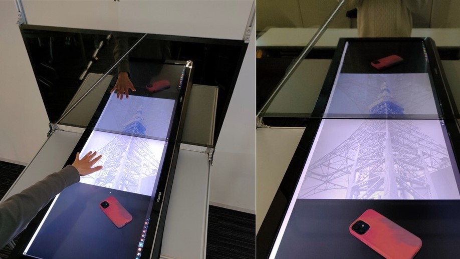 A table-type device that projects 3D images in mid-air using aerial imaging technology (AIRR) based on retroreflection. Shadow-based interaction techniques enhance the sense of reality of the images.