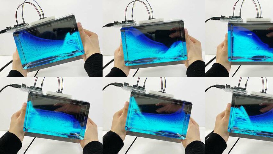 An interface system that enables indirect interaction by tilting the stereoscopic display itself. The display is treated as a container, achieving virtual liquid manipulation through fluid simulation.