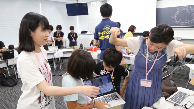 各グループには大学生がアシスタントとしてつき、アニメーション製作の手伝いをしています。今回使用したアニメーション製作ソフトは、このワークショップのために新たに設計した「LooneyStudio」を使っています。