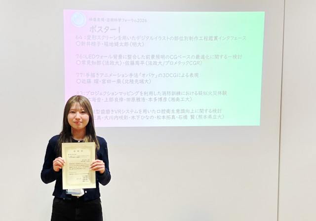 2026年3月3日に開催された「映像表現・芸術科学フォーラム2026」での、新井椋子らによるポスター発表「変形スクリーンを用いたデジタルイラストの部位別制作工程鑑賞インタフェース」が優秀賞を受賞しました。