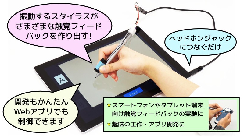 触覚フィードバック機能を搭載したペン入力機器用スタイラス VibraPen を開発しました。入手の容易な部品で構成され、端末との接続はオーディオインタフェースを用いているため、実装が簡便で接続も容易なのが特徴です。