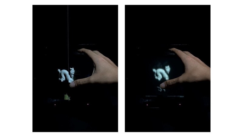 AIRRと立体ディスプレイを用いて、空中に3DCGを立体映像として表示できる空中立体映像装置に対し、現実の光学環境を反映した陰影を付与することで、空中像の実在感を高める手法を提案しました。