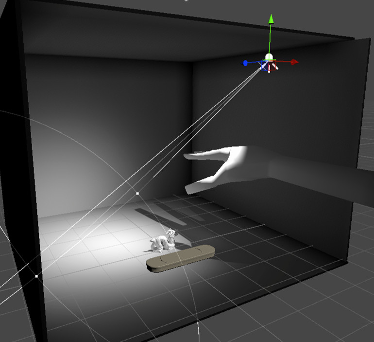 具体的には、現実の光源や空中像周囲の環境を手動で測定し、さらに手追跡センサを用いて、動く手の情報をリアルタイムに取得します。そのデータをもとに仮想空間上で現実の光学環境を再現し、実際の光や手とのインタラクションを反映した陰影をリアルタイムで計算します。