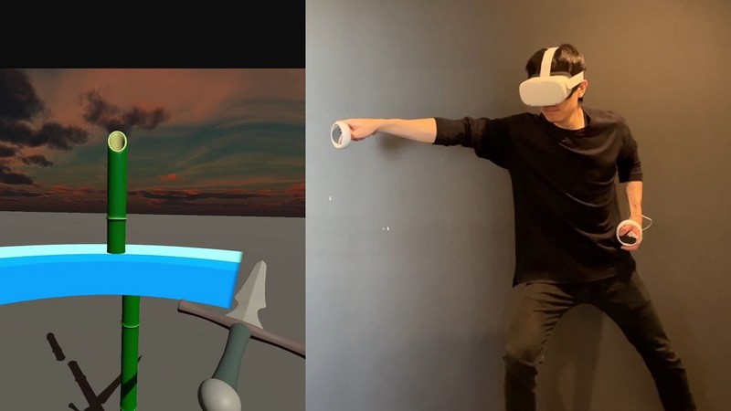 VR空間内で剣を振る際、体験者の操作そのままの速度では剣の動きが遅く感じられ、爽快感が弱まるという問題がありました。本研究では斬撃動作の開始を検知するとその動きを予測し、腕の動きよりも速く剣を振りぬくアニメーションを提示することで、あたかも自分が剣の達人になったかのような気分を味わえる手法を開発しました。