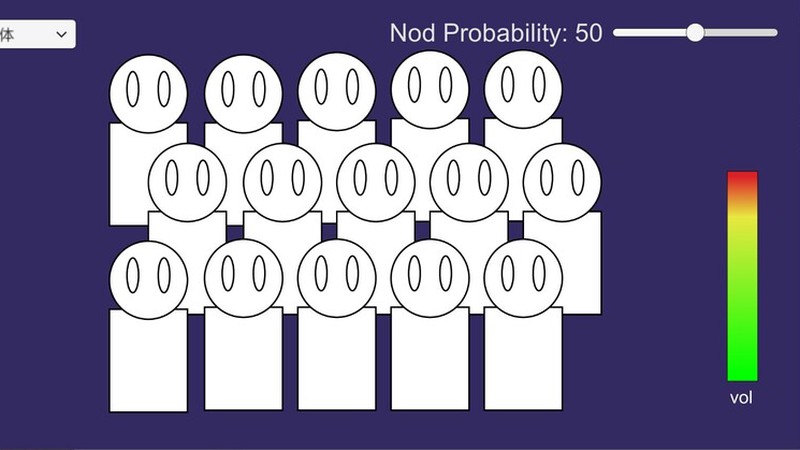 本研究室ではプレゼンテーション練習やスピーチ訓練のために、VR空間内に多数のCGキャラクターで仮想聴衆を形成し、利用者の話に対して音声駆動型うなずき生成モデルによりうなずきを行わせるシステムを開発してきました。これらのシステムでは発話音声のリズムに合わせて自動的にうなずきを生成しますが、自然な頻度でうなずかせるための調整を必要としています。