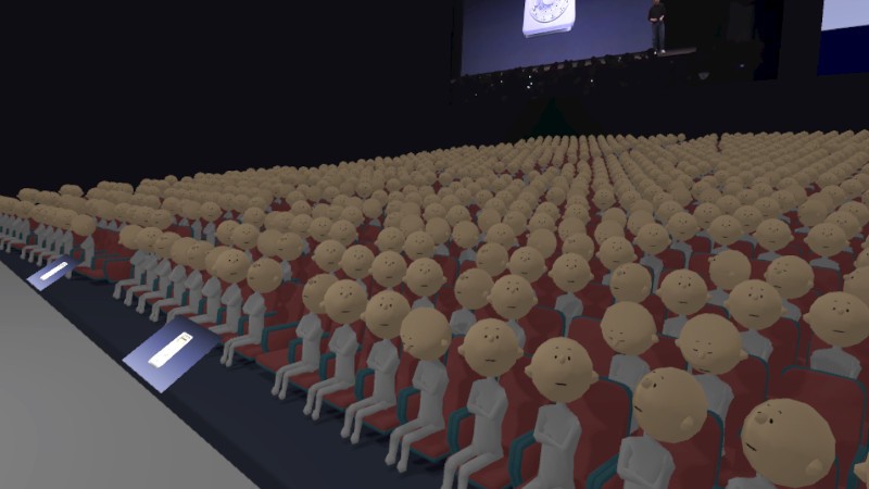 会場には仮想観客を配置しています。仮想観客はスピーチやプレゼンテーションの進行に応じて様々な反応を返すように設計しています。例えばスライドが変わればスクリーンの方を向いたり、体験者が大きく動けばその方を向き、話の内容に応じて拍手したりするなどです。仮想観客には個性が設定されており、それぞれの興味に応じて反応の仕方が異なるようになっています。